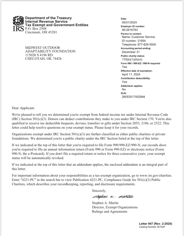 Below, you will find our official 501(c)(3) approval letter, verifying our status as a certified nonprofit organization. This ensures that there is no doubt about the work we are doing and the positive impact we aim to make in the lives of those we serve.